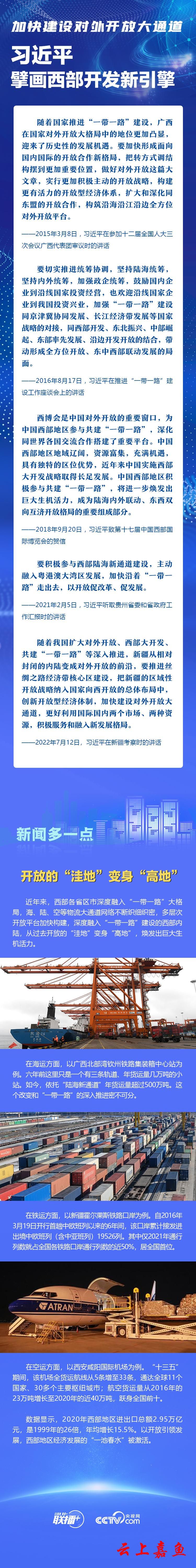 “随着共建‘一带一路’深入推进,新疆不再是边远地带,而是一个核心区、一个枢纽地带,你们做的是具有历史意义的事情,已经取得很好的成绩,再接再厉,前途光明。”习近平总书记在新疆考察时的这番话,令在场的干部群众激动不已。 新疆取得的好成绩是近年来西部发展的一个缩影。随着“一带一路”建设深入实施,西部地区把握新机遇积极参与、深度融入,加快建设对外开放大通道,从过去开放的“洼地”变身“高地”,迈出发展新步伐。 央视网《联播+》特推出长图解,与您一起学习。 来源:中央广播电视总台央视网