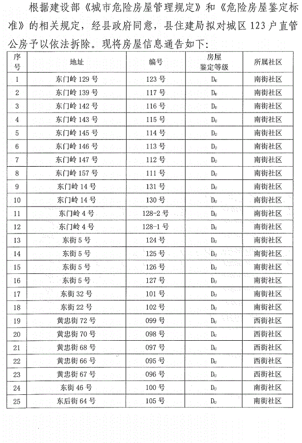 县住建局关于城区D级直管公房拆除的通告