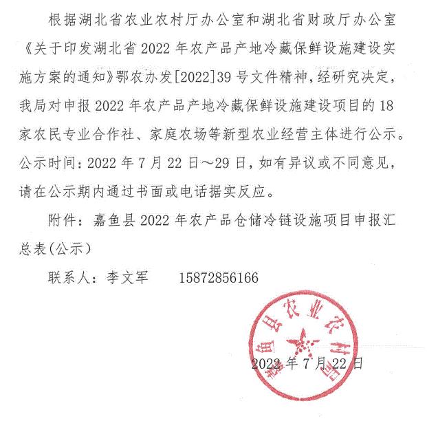 关于2022年农产品产地冷藏保鲜设施建设项目申报情况公示