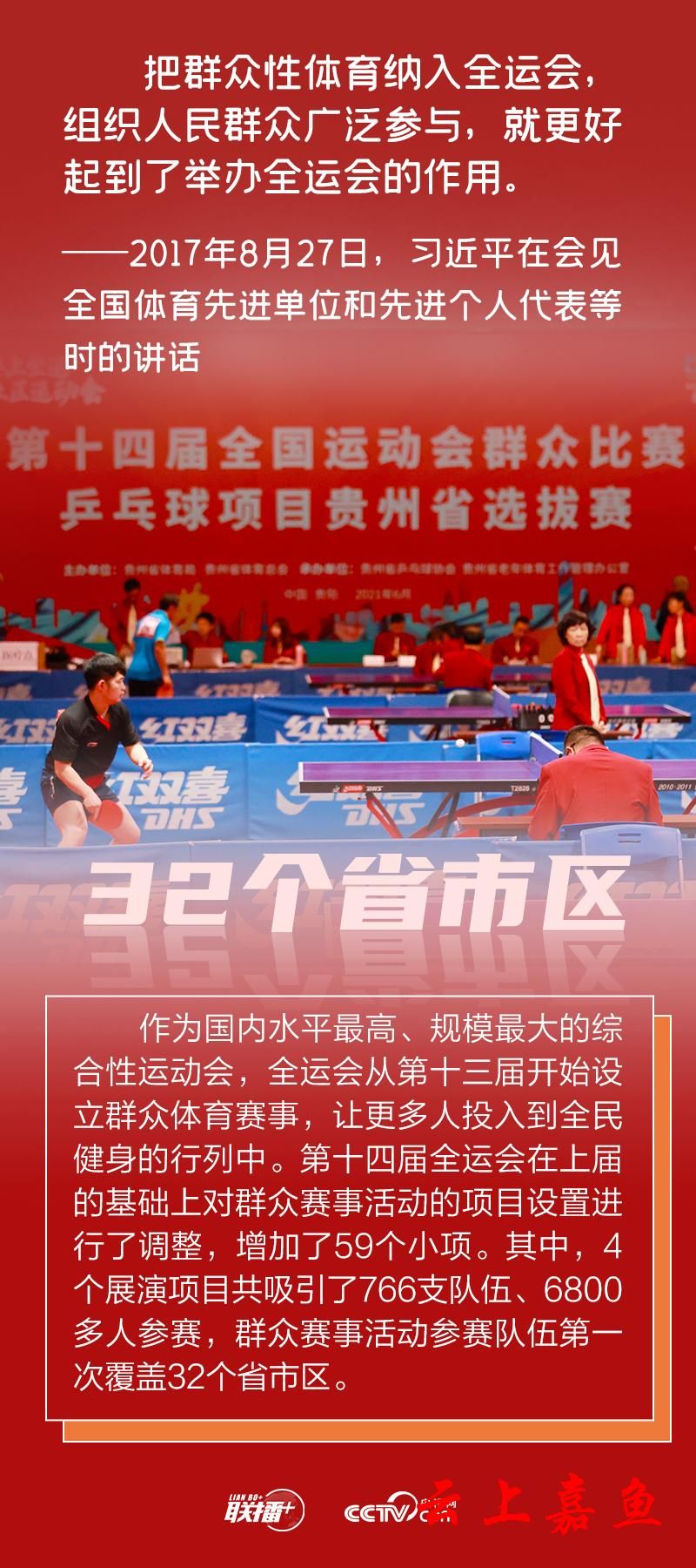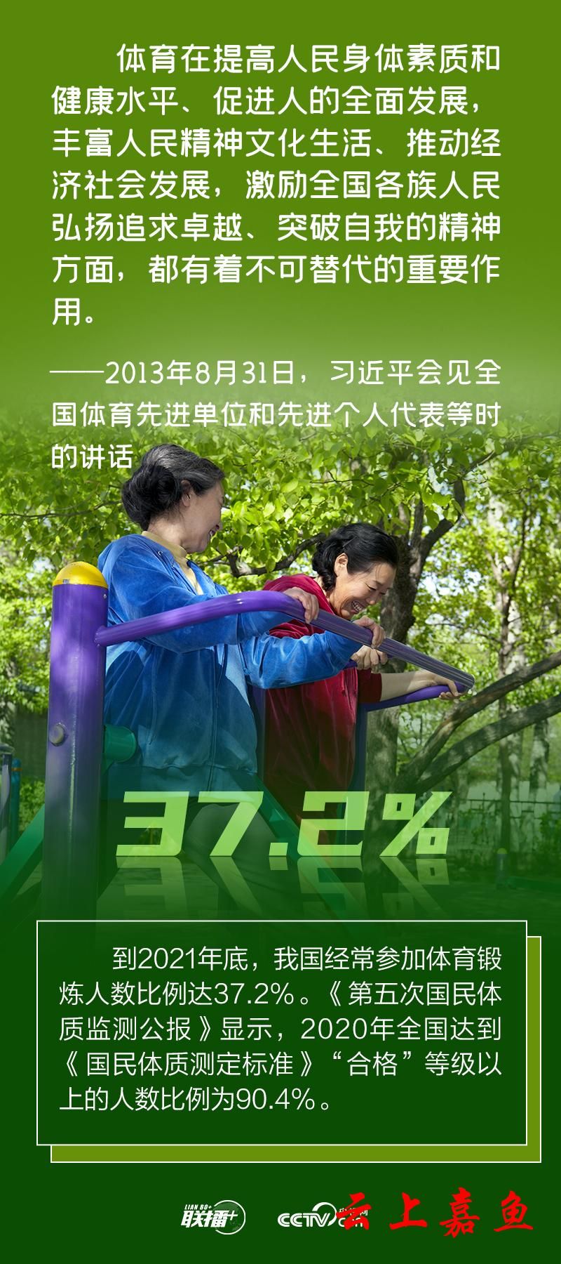 全民健身是全体人民增强体魄、健康生活的基础和保障,身体健康是每一个人成长和实现幸福生活的重要基础。 党的十八大以来,习近平总书记亲自谋划推动体育事业改革发展,坚持深入实施全民健身国家战略,全民健身场地设施明显改善,群众性体育赛事活动繁荣发展,全民健身参与程度不断提高,人民群众生活方式更加健康快乐。 央视网《联播+》“数说新时代”系列特推出创意海报,与您一同了解。 来源:央视网