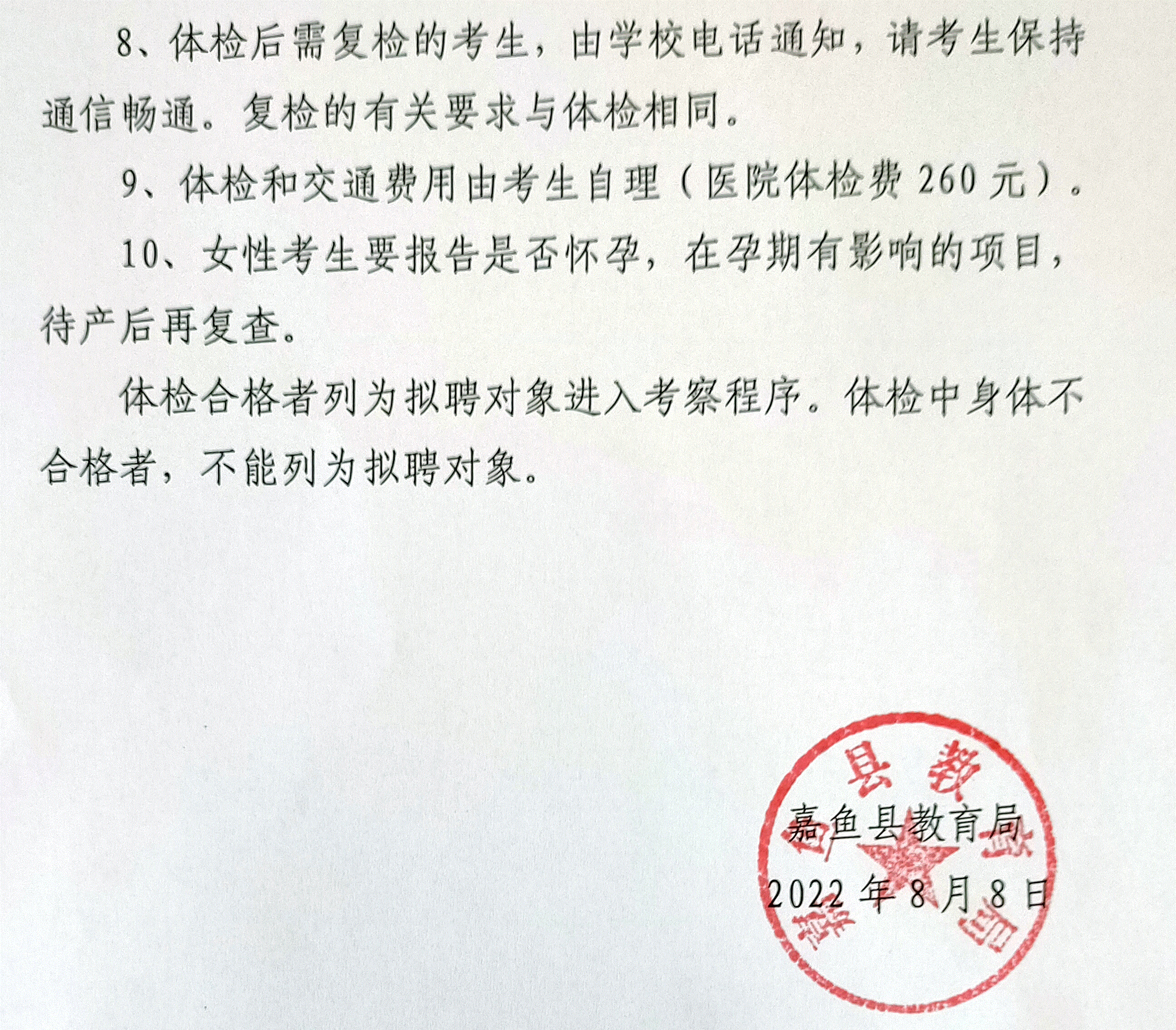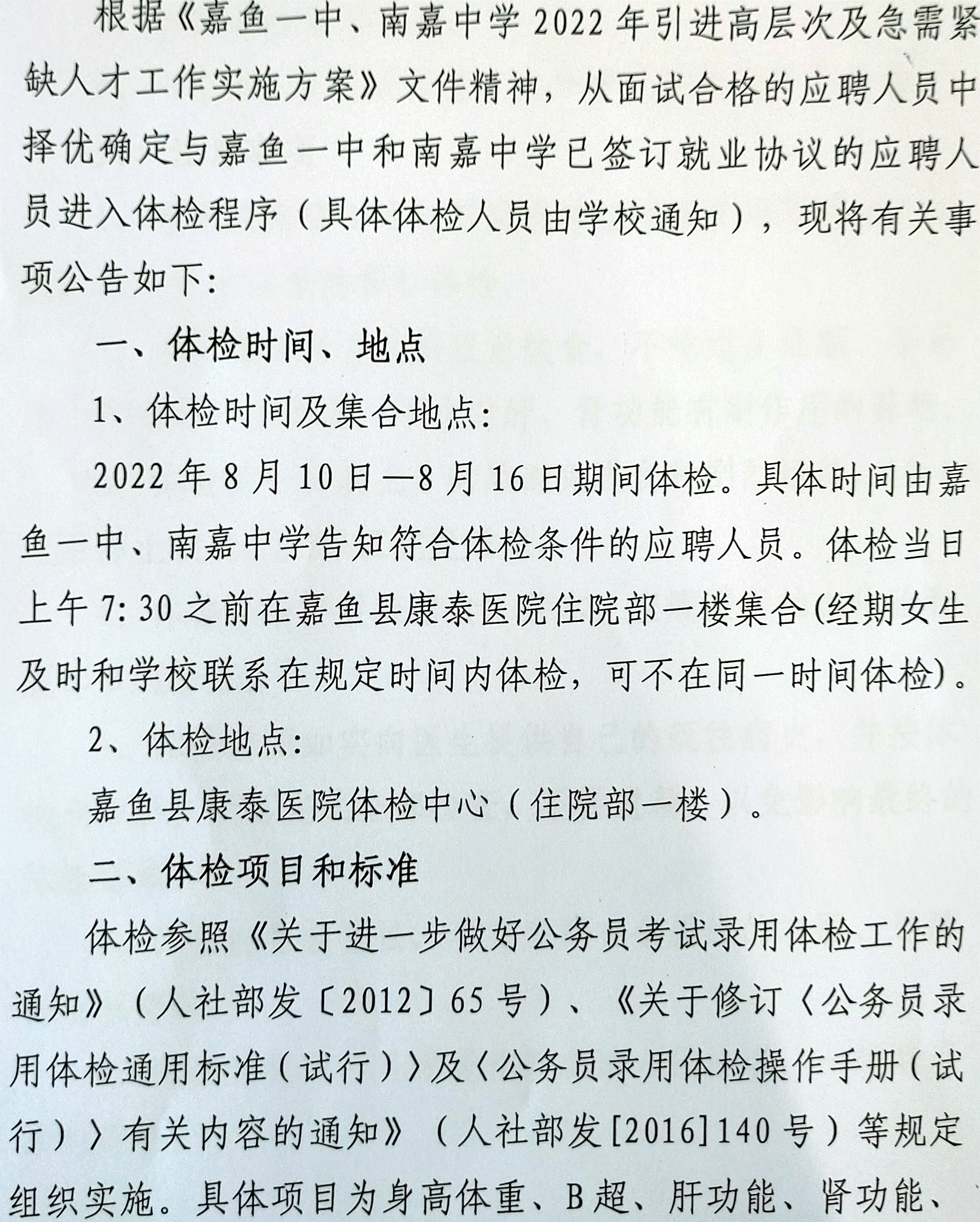 嘉鱼一中、南嘉中学2022年引进高层次及急需紧缺人才体检通知