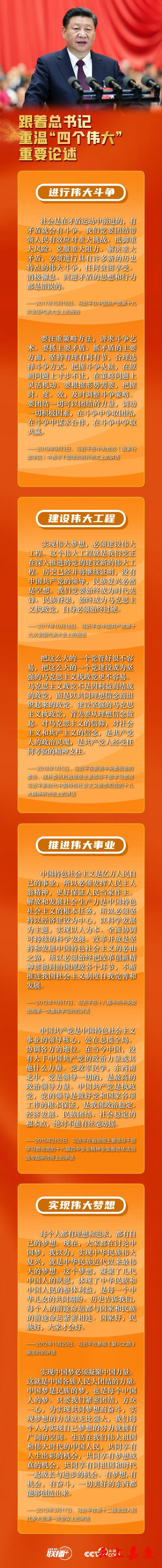 习近平总书记在党的十九大报告中强调,实现伟大梦想,必须进行伟大斗争,建设伟大工程,推进伟大事业,并深刻指出四者“紧密联系、相互贯通、相互作用”。 “四个伟大”是对我国改革开放和社会主义现代化建设实践经验的根本总结,是党的十八大以来,以习近平同志为核心的党中央治国理政的总体框架和推进理论创新的实践基础,是制定中国特色社会主义发展新阶段行动纲领的基本遵循。央视网《联播+》特梳理总书记关于“四个伟大”的重要论述,与您一起学习。 来源:央视网