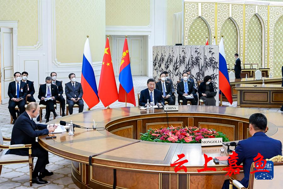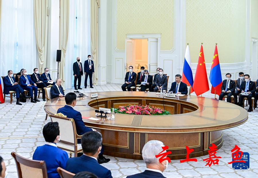 当地时间9月15日下午,国家主席习近平在撒马尔罕国宾馆同俄罗斯总统普京、蒙古国总统呼日勒苏赫举行中俄蒙三国元首第六次会晤。新华社记者 翟健岚 摄