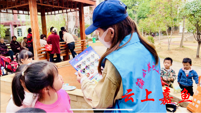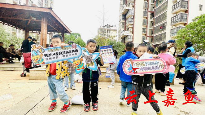 云上嘉鱼报道(全媒体记者熊琦)“小朋友们想不想做皮皮小超人,远离烫烫小怪兽呀?”10月26日,在嘉御园小区预防烧烫伤主题科普宣传活动现场,来自嘉鱼县蒲公英社工中心的志愿者正在为小朋友们讲解预防烧烫伤知识。