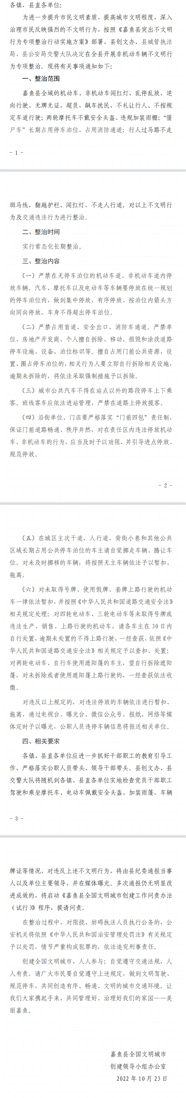 关于开展机动车、非机动车辆不文明行为专项整治的通知