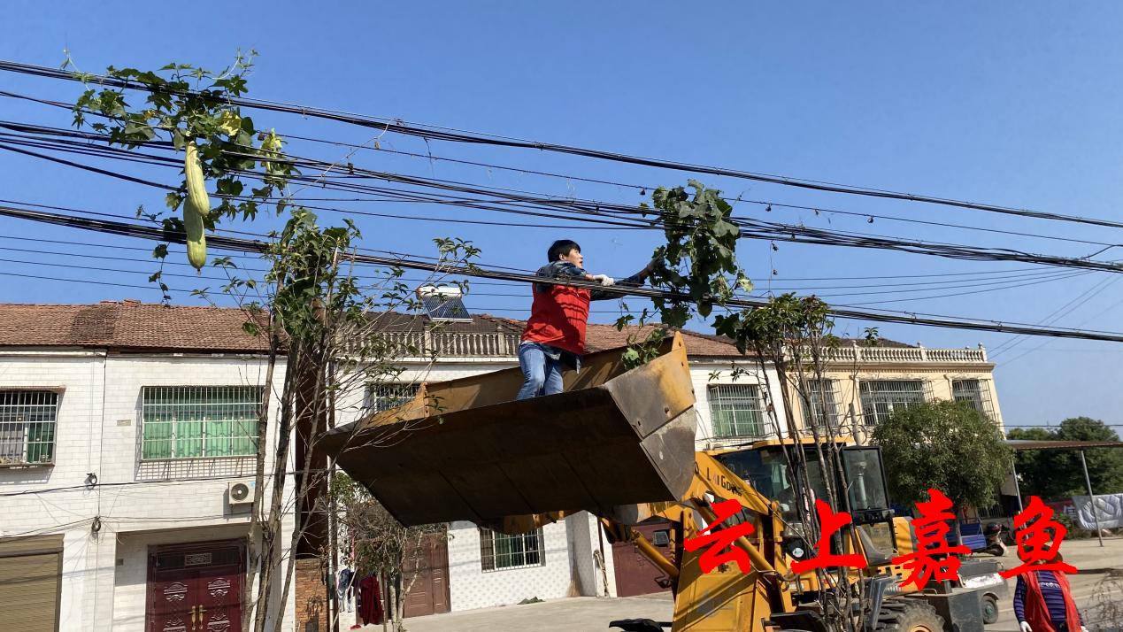 “这丝瓜长得太高了,都爬到光缆线上去了,平日里也摘不着!”村道旁边有一户村民种的丝瓜爬上了光缆线,非常不安全,村干部正商量怎么处理,一位村民就开来了自家铲车,志愿者站在铲车里被高举上去对丝瓜藤进行了清理。