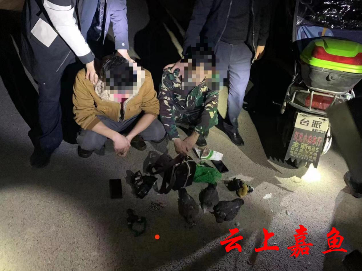 10月20日,当地村民向县公安局潘家湾派出所反映,在潘家湾镇畈湖工业园附近一湿地晚上有人打鸟。“非法狩猎野生鸟类”这一情报引起派出所的高度重视。当天下午,民警便装来到湿地周边查看地形,经分析研判,非法狩猎者可能会继续作案,为抓现行,潘家湾派出所当即进行了周密部署。当晚18时,一组警力悄悄来到湿地附近一制高点观察湿地周边情况,另一组警力则在附近蹲守张网以待。19时许,目标出现,一道可疑的灯光引起蹲守民警的注意,经仔细观察分析,确定系非法狩猎嫌疑人后,民警兵分三路赶到现场并潜入湿地。悄悄向嫌疑灯光出现的地域展开围捕。因湿地周边平时极少有人进出,遍地荆棘丛生、沟坑遍布,给围捕行动带来极大难度,为不惊扰嫌疑人,民警在不能开灯的情况下,顾不上脚手被割伤划伤。经过一个小时的围捕,21时许,民警在湿地深处将正在用弹弓非法狩猎的两名嫌疑人抓获,现场查获打鸟弹弓、音响等狩猎工具,以及猎取的3只“三有”野生动物斑鸠。