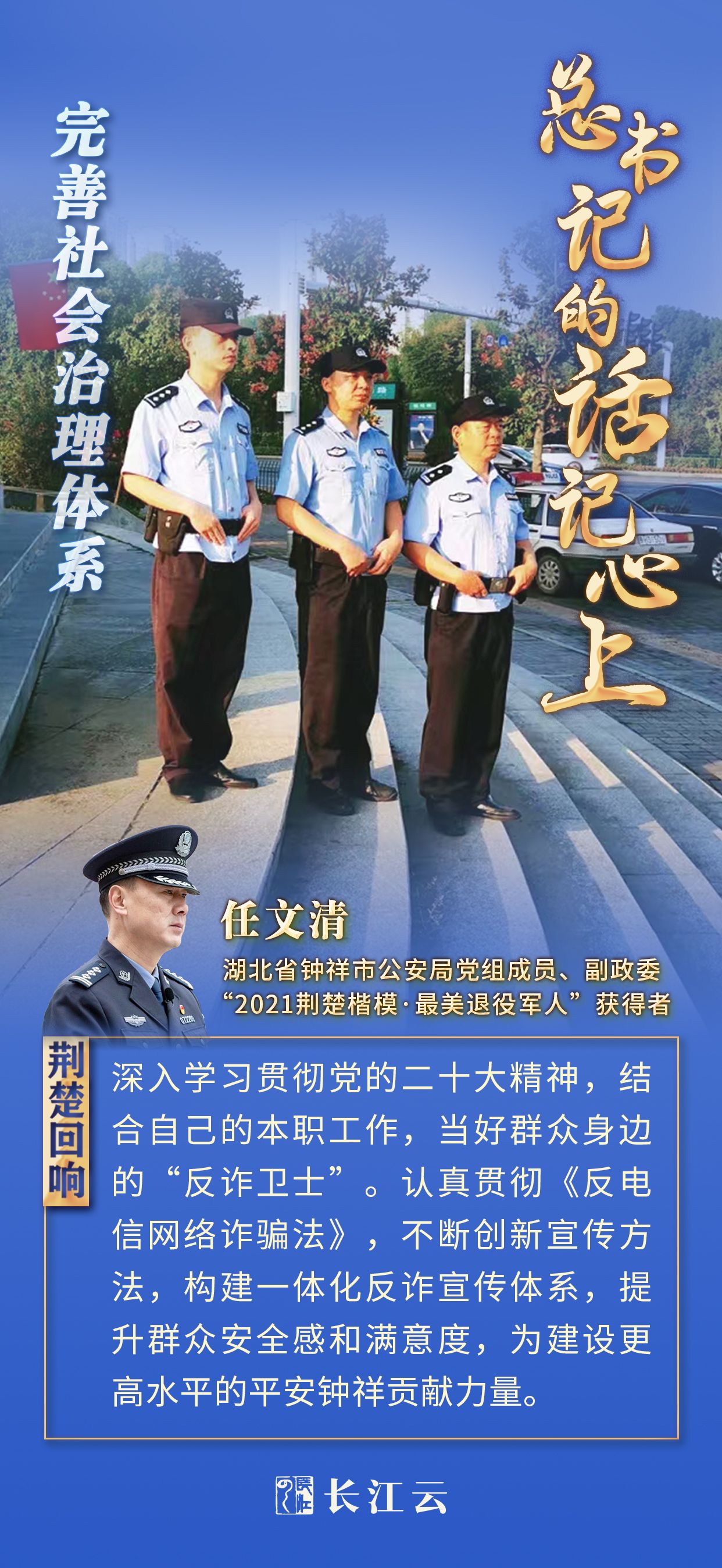 湖北省钟祥市公安局党组成员、副政委,“2021荆楚楷模·最美退役军人”获得者任文清:党的二十大报告指出,强化社会治安整体防控,推进扫黑除恶常态化,依法严惩群众反映强烈的各类违法犯罪活动。作为一名基层公安领导干部,我将深入学习贯彻党的二十大精神,当好群众身边的“反诈卫士”,认真贯彻《反电信网络诈骗法》,不断创新宣传方法,构建一体化反诈宣传体系,最大限度强预警、压发案、降警情,扎扎实实提升群众安全感和满意度,为建设更高水平的平安钟祥贡献力量。 来源:长江云