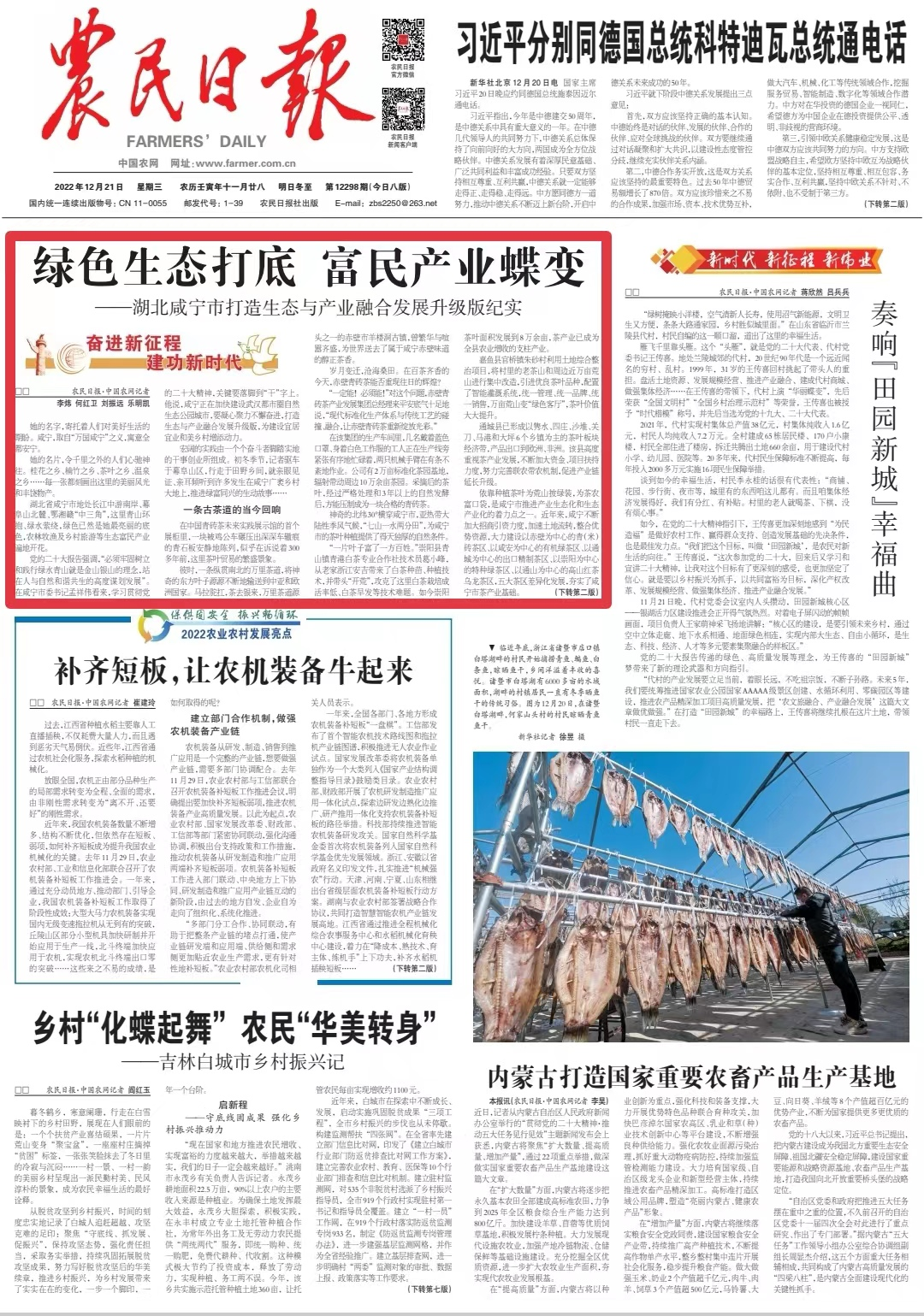 党的二十大报告强调,“必须牢固树立和践行绿水青山就是金山银山的理念,站在人与自然和谐共生的高度谋划发展”。在咸宁市委书记孟祥伟看来,学习贯彻党的二十大精神,关键要落脚到“干”字上。他说,咸宁正在加快建设武汉都市圈自然生态公园城市,要凝心聚力不懈奋进,打造生态与产业融合发展升级版,为建设宜居宜业和美乡村增添动力。