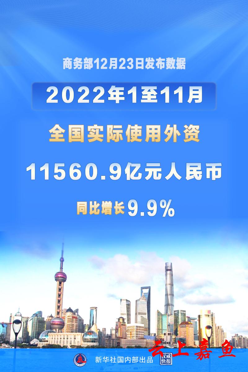 商务部12月23日发布数据显示 2022年1至11月 我国实际使用外资11560.9亿元人民币 按可比口径同比增长9.9% 折合1780.8亿美元,同比增长12.2% 高技术产业实际使用外资同比增长31.1% 来源:新华社