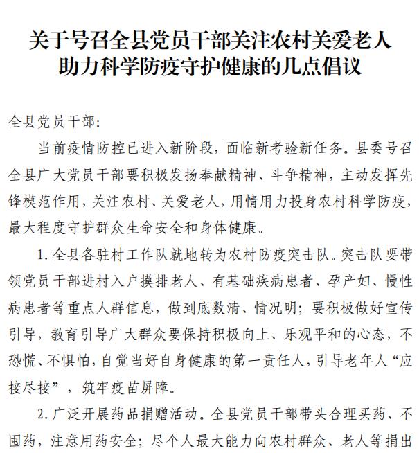 关于号召全县党员干部关注农村关爱老人 助力科学防疫守护健康的几点倡议
