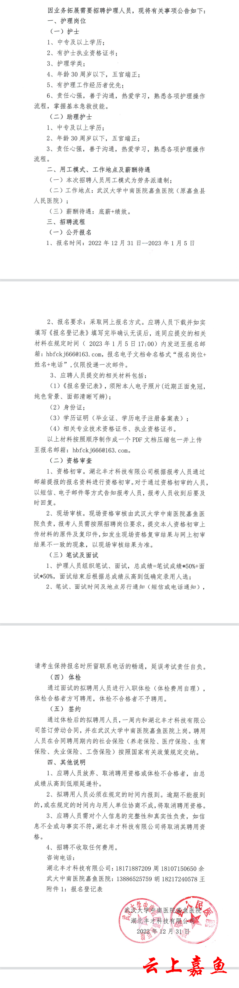 武汉大学中南医院嘉鱼医院 招聘护理人员公告