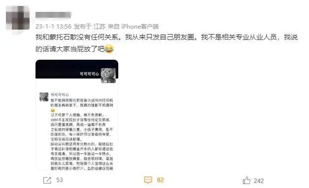 “朋友圈的所有内容都是我自己搜索所得,自己总结,但是主攻心脑血管和拉肚子事后忘记出处,所以我发了第二条朋友圈说明了。这件事从头到尾我不知情,文章是发在私人朋友圈,我也没有任何主动散布到微信群、微博等公众平台,网上所有截图均是别人截的并且转发,我的手机里有所有微信群聊天记录可以证实没有发过。”