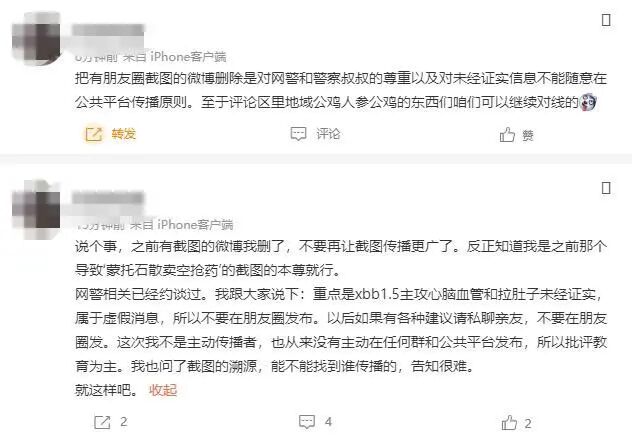 2日下午,黄可告诉上游新闻记者,无锡当地派出所的民警还是找上了门,“下午就去做了笔录,手机朋友圈的内容全部拍照留档了,民警表示,重点是XBB1.5主攻心脑血管和拉肚子未经证实,属于虚假消息,所以不要在朋友圈发布。以后如果有各种建议请私聊亲友,不要在朋友圈发。这次我不是主动传播者,也从来没有主动在任何群和公共平台发布,所以批评教育为主。”