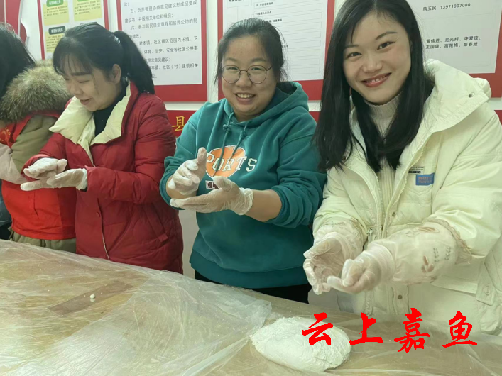 一大早,工作人员准备好糯米粉、面粉和各种馅料,与辖区居民一起包汤圆、包饺子,庆祝元宵佳节的到来。搓、捏、按、团,一块块白白的糯米面团被捏成一个球,压成一个饼,再包上馅……不一会儿,芝麻馅、豆沙馅的汤圆逐渐装满圆盘。