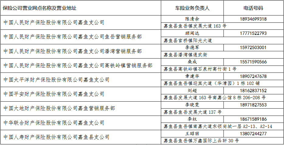一、嘉鱼县辖内所有财产保险公司各营业网点均可办理机动车交通事故责任强制保险业务(以下简称“交强险”)。