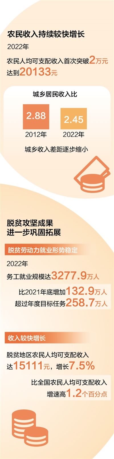 增加农民收入是“三农”工作的中心任务。2022年,农民人均可支配收入首次突破2万元,城乡居民收入比从2012年的2.88下降到2022年的2.45,城乡收入差距逐步缩小。“也要看到,当前农民收入增速有所放缓,增收动能有所减弱。必须高度重视,拿出长短结合、务实管用的硬措施,拓宽农民增收致富渠道。”中央农办专职副主任、农业农村部党组成员吴宏耀说。对此,今年中央一号文件在稳定就业、经营增效、挖潜财产收入以及拓展转移收入等方面作出相关部署,努力让农民腰包越来越鼓,日子越过越红火。