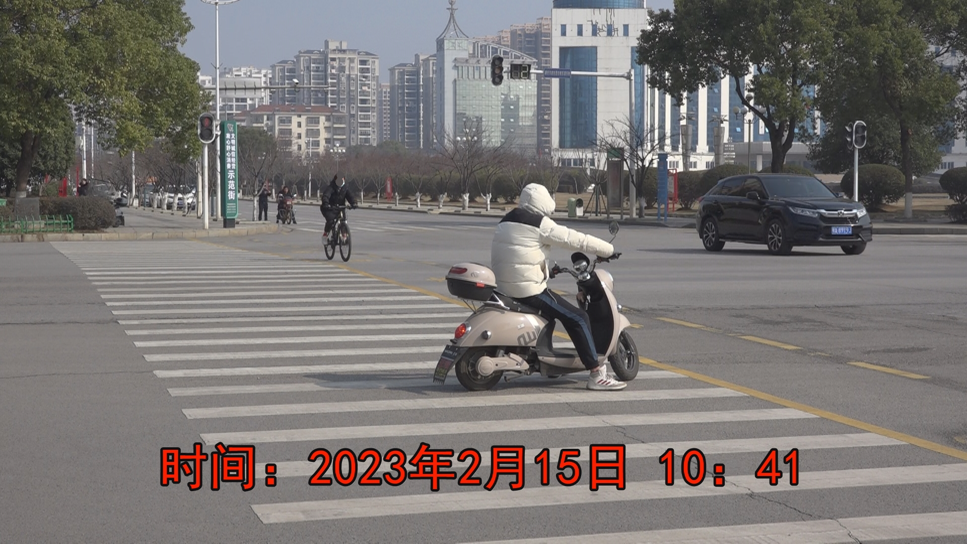 2月15日10:41,电瓶车停在斑马线上等红绿灯。