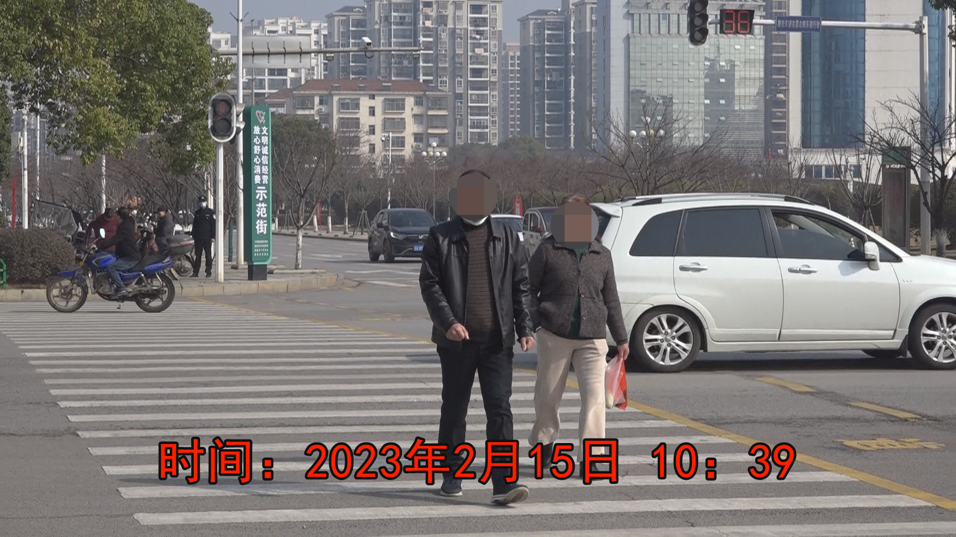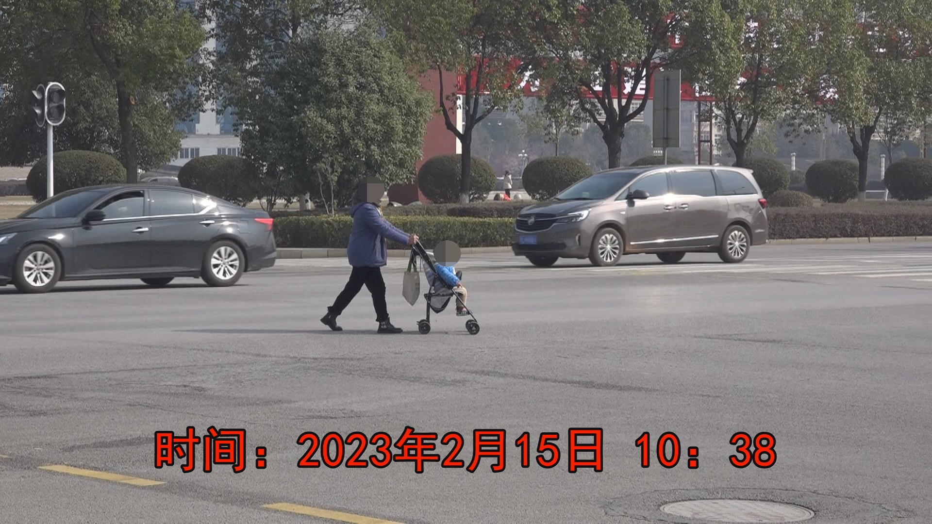 2月15日上午10:38,一妇女推着一辆婴儿车从电信大楼路口(西南角),快速斜穿马路,来到人民公园路口(东北角)。