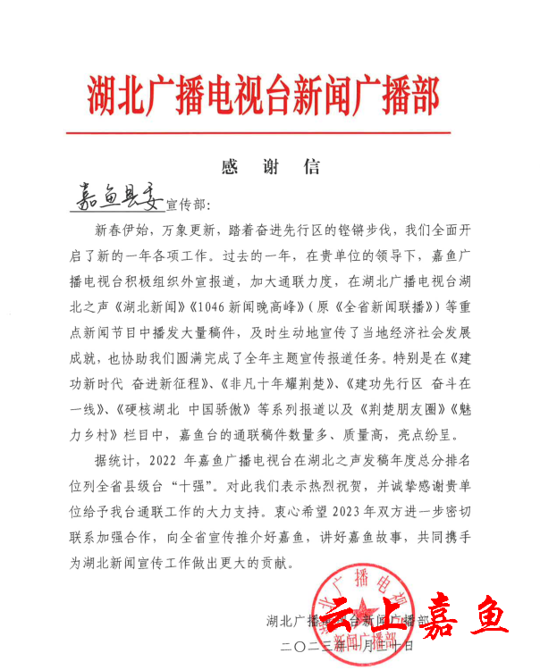 无独有偶,1月30日,县委宣传部收到一封来自湖北广播电视台新闻广播部的感谢信。信中提到:“2022年,嘉鱼县融媒体中心积极组织外宣报道,在湖北之声《湖北新闻》《1046新闻晚高峰》等重点新闻节目中播发了大量稿件。”