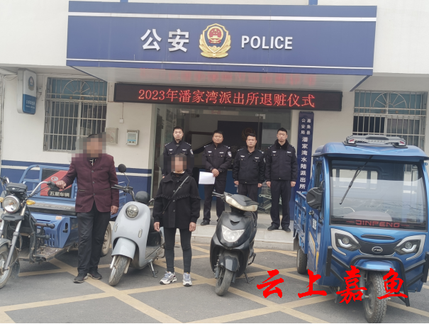 2月28日,县公安局潘家湾水陆派出所门前摆放着四辆被盗的二轮、三轮摩托车,4名失主在民警的指引下,依次填写、确认个人信息、领回属于自己的摩托车。失主周某领到失而复得的摩托车心情十分激动,特意制作一面锦旗送来,并说:“我的摩托车是2022年11月份被偷的,我没想到这么快就把摩托车找回来了,非常感谢潘家湾派出所民警的辛勤付出,把这个小偷给抓住了,让我们人民群众的财产和生命安全得到了保障。”