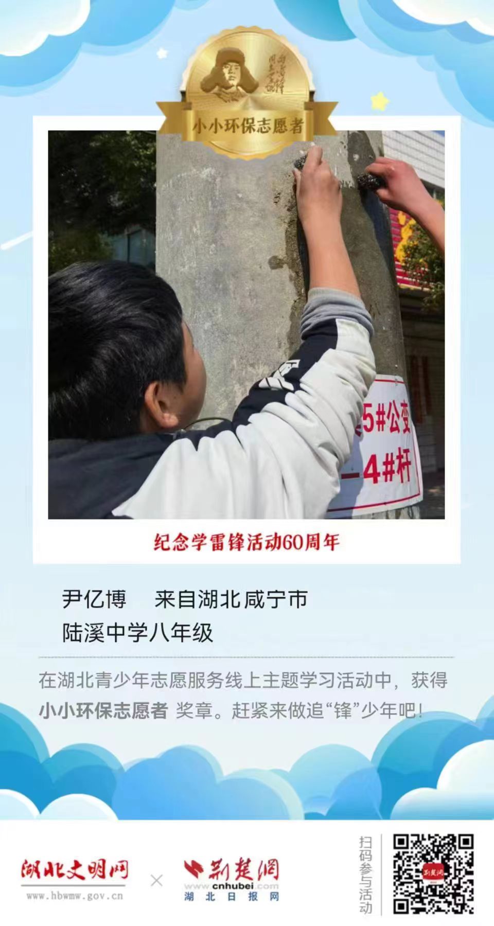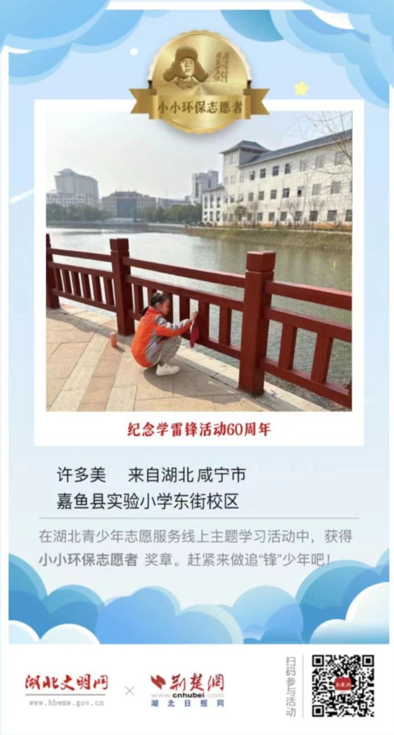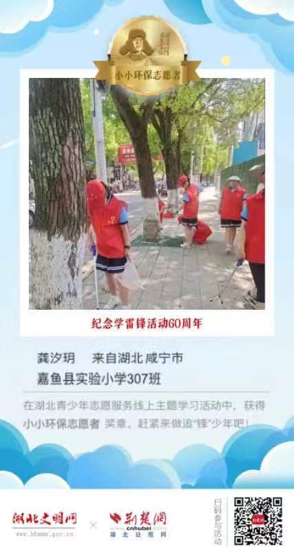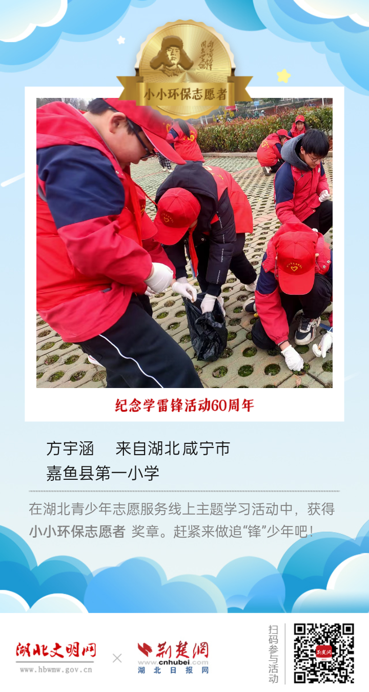 2023年3月5日是第60个全国“学雷锋纪念日”,为进一步弘扬“奉献、友爱、互助、进步”的志愿精神,引导广大青少年学习雷锋,赓续雷锋精神,省文明办、省教育厅、团省委联合湖北文明网、荆楚网(湖北日报网)在“学雷锋纪念日”期间,组织开展“让我们一起做追‘锋’少年!”湖北青少年志愿服务线上主题学习活动。