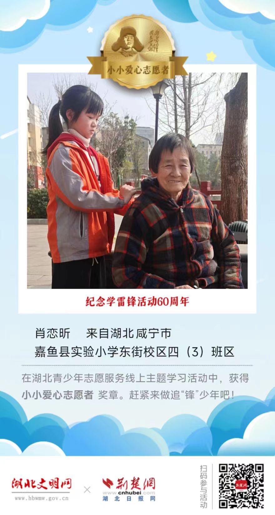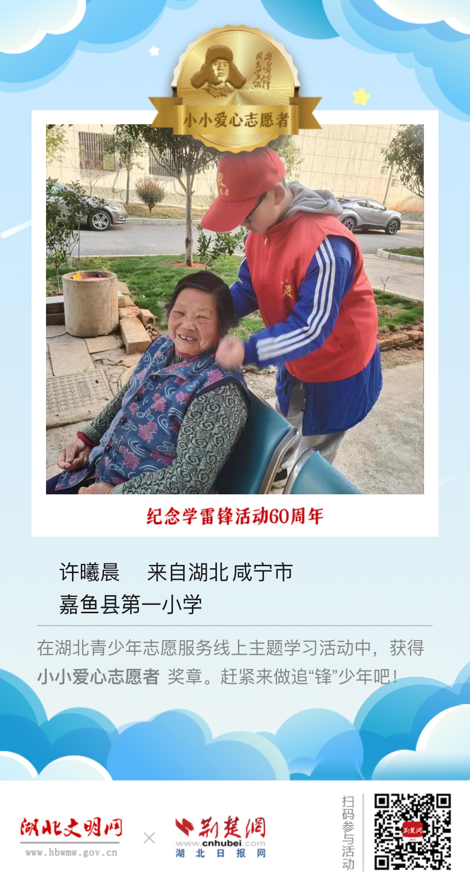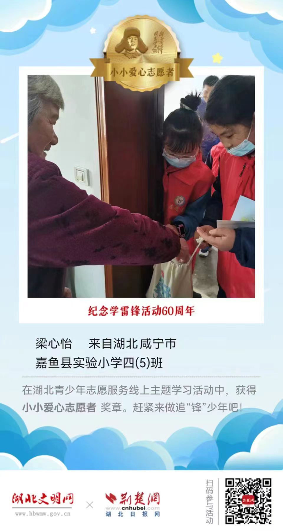 2023年3月5日是第60个全国“学雷锋纪念日”,为进一步弘扬“奉献、友爱、互助、进步”的志愿精神,引导广大青少年学习雷锋,赓续雷锋精神,省文明办、省教育厅、团省委联合湖北文明网、荆楚网(湖北日报网)在“学雷锋纪念日”期间,组织开展“让我们一起做追‘锋’少年!”湖北青少年志愿服务线上主题学习活动。