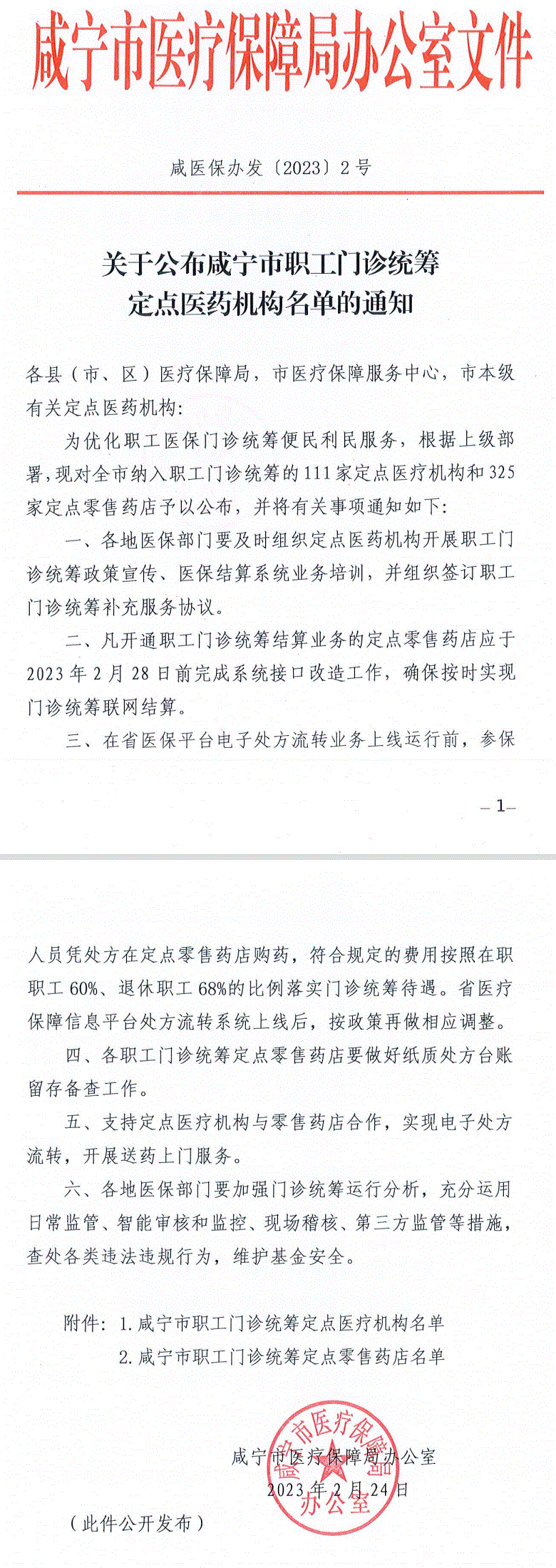 关于公布咸宁市职工门诊统筹定点医药机构名单的通知