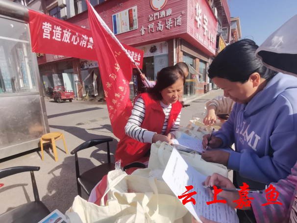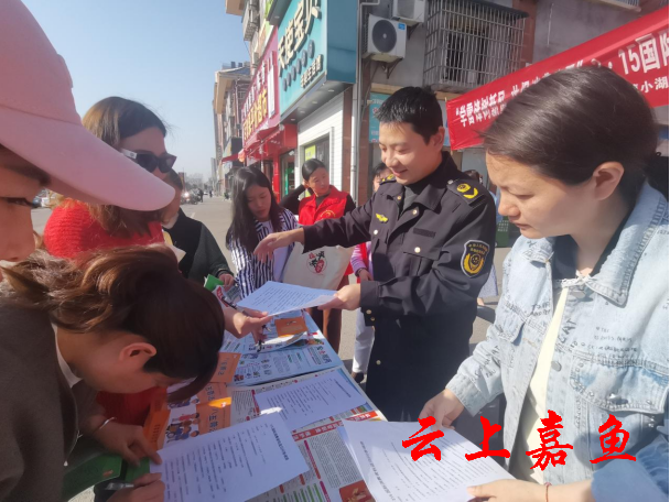 云上嘉鱼报道(通讯员王雯倩)3月15日,鱼岳镇小湖社区新时代文明实践站联合新街市场监管执法支队、司法所到红星商贸城开展了“学雷锋树新风 共促消费公平”3.15国际消费者权益日主题宣传活动。