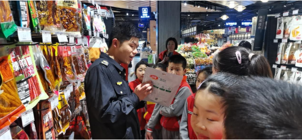 课堂外,工作人员带领学生们进入某食品销售店铺,以课堂学习与现场实践相结合的方式,对同学们学到的食品安全知识进行了巩固,让同学们灵活运用所学食品安全知识甄别、选购食品。