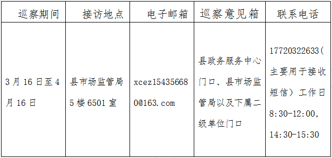 巡察组在嘉鱼县市场监督管理局党组巡察期间,具体联络方式如下: