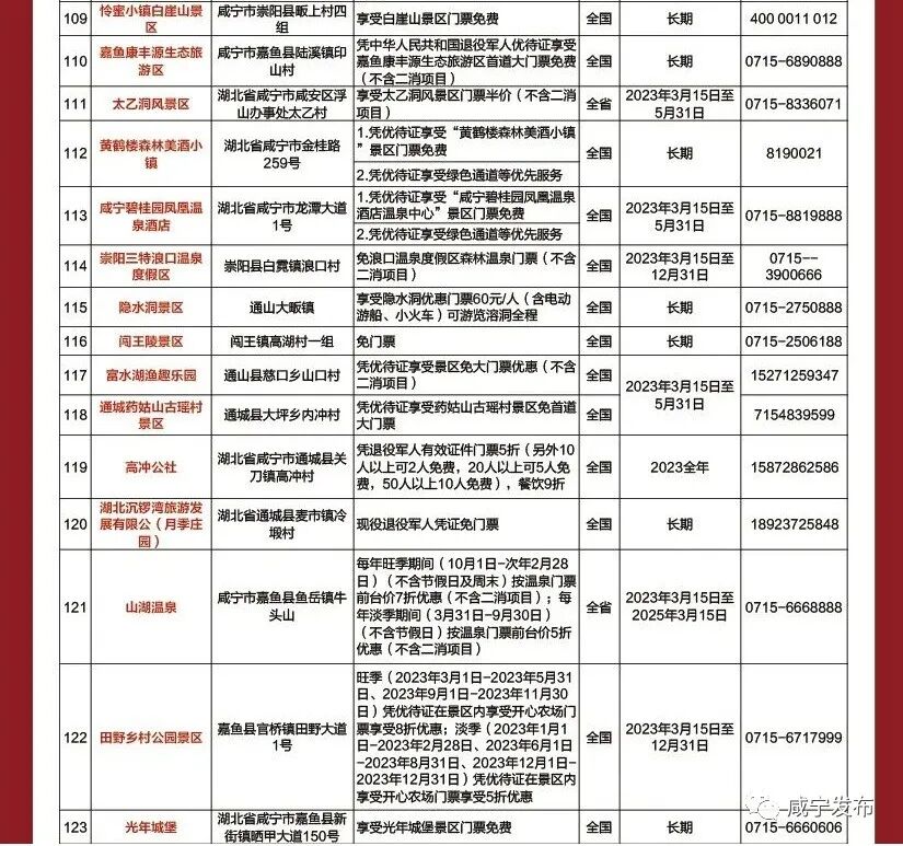 3月14日,我省启动“游荆楚、享尊崇、葆本色”2023退役军人“春游湖北”活动。我市15家景区向全省、全国退役军人发出春游邀请,广大退役军人可凭“优待证”可免票或半票游咸宁。