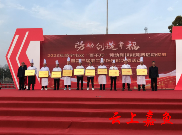云上嘉鱼报道(全媒体记者胡知微)3月26日,由咸宁市总工会、咸宁市委文明办、市人力资源和社会保障局联合主办的2023年咸宁市双“百千万”劳动和技能竞赛启动仪式暨第三届职工烹饪技能大赛在咸宁市人民广场隆重举行,来自全市各县市区的30多位大厨们同台竞技,纷纷亮出精彩绝活,展现带有地方特色的美食佳肴,经过选手抽签答题、评委品尝打分和选手介绍菜品等多个比赛环节,最终嘉鱼代表队以优异成绩勇摘桂冠。