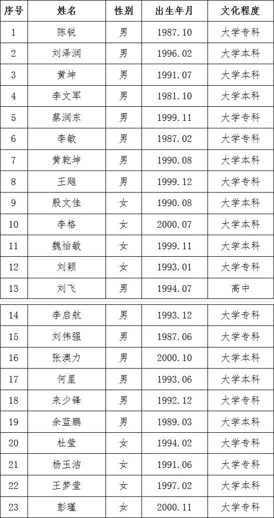 根据《2022年嘉鱼县农业农村局公开招聘劳务派遣工作人员公告》,经报名、资格审查、笔试、面试、政审、体检、考察等程序,按照择优录用原则,拟录用陈锐等23名同志为嘉鱼县农业农村局劳务派遣工作人员,现予以公示: 公示期为2023年3月30日至4月5日。公示期间,如对公示对象有异议,请在公示期限内,以书面、电话或直接向嘉鱼县农业农村局3058办公室反映,要求实名反映情况。联系地址:嘉鱼县发展大道168号嘉鱼县农业农村局;联系电话:0715-6358277。