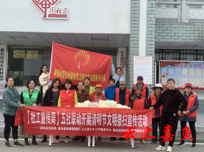 云上嘉鱼报道(通讯员周璇 刘成林)“您好,我们准备了鲜花,建议您采用鲜花祭扫,绿色又环保……”3月31日,嘉鱼县民政局、嘉鱼县殡葬管理所、嘉鱼县心之泉社会工作服务中心联合新街镇民政办、港东村开展嘉鱼县五社联动清明节文明祭扫宣传活动。