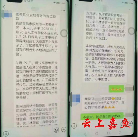 时间追溯到3月29日8时,巡警大队值班民警接到110指令,称山东省市民匡某某求助嘉鱼警方,其儿子孙某某与家人闹矛盾后于3月26号从山东省青岛市开车离开,期间孙某某手机一直处于关机状态,家人联系不上孙某某后十分着急,害怕孩子发生意外。在获知孙某某所开的车辆出现在嘉鱼县境内后,家人便立即拨打当地110寻求嘉鱼民警帮助。