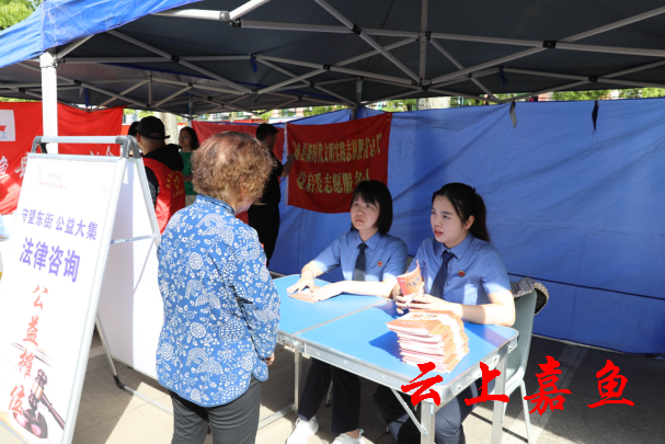 嘉鱼县检察院作为东街社区联合共建单位,同时也是爱心法律服务志愿服务队成员,派出两名干警“出摊”,在法律咨询公益摊位上为前来“赶集”的群众提供法律咨询。