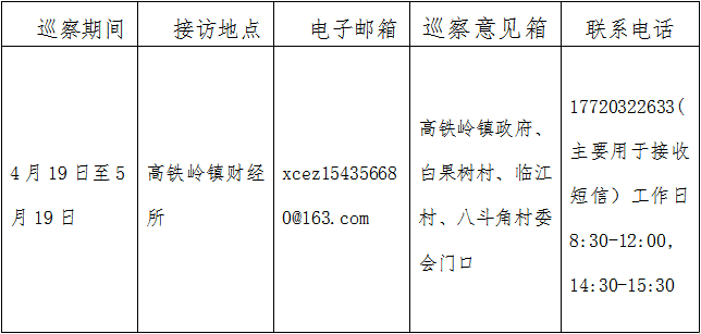 巡察组在高铁岭镇白果树村、临江村、八斗角村党组巡察期间,具体联络方式如下: