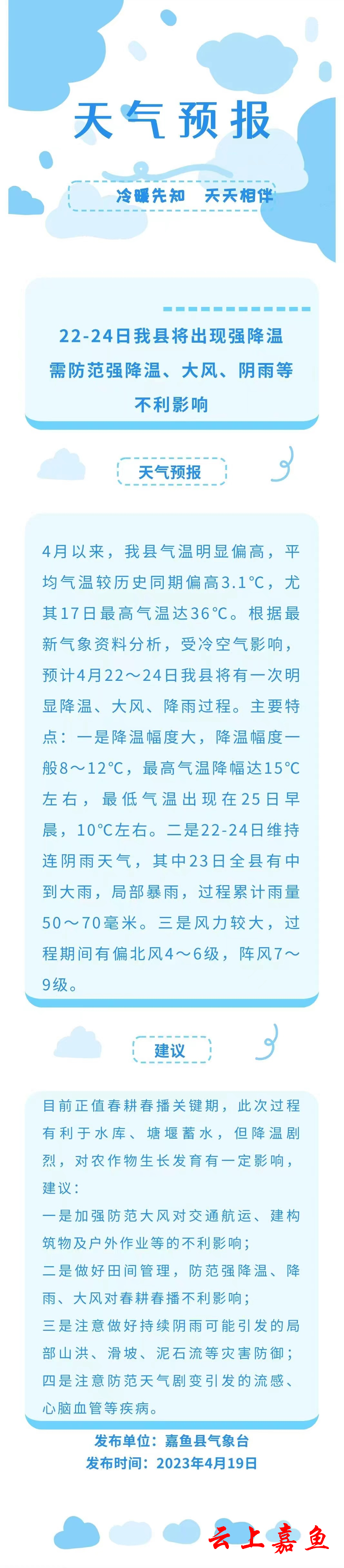 22-24日我县将出现强降温,需防范强降温、大风、阴雨等不利影响