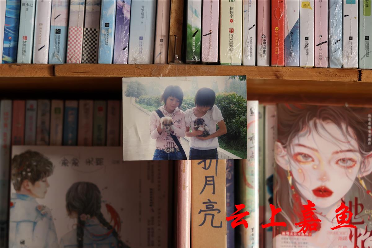 “夹在书本里的,我拿出来贴在店里,等她回来拿。”薛萍指着书架上一张微微泛黄的照片,露出淡淡的微笑。这是一张合照,两个小女孩,一人手里抱着一只小奶狗。“小狗应该是那时候店里收留的流浪狗生下的奶狗。”薛萍介绍,最高峰的时候店里曾经收养了五、六只流浪猫狗,“那些小猫小狗真的是有灵性的,它路过我的店里,只要我给它一个关怀的眼神,它就留下来不走了,好像知道你会收留它。”店里猫狗多了,上蹿下跳,虽然可爱,也害怕伤害到来看书的学生。学生们都很喜欢这些小动物,有些家长和孩子想要领养,薛萍便会帮猫狗们找到一个新的人家。把合照夹在书里的女孩,应该是若干年前的一个租书者,那时薛萍店里还做租书业务,前两年薛萍把这些租书重新整理出来,发现了这张合照。