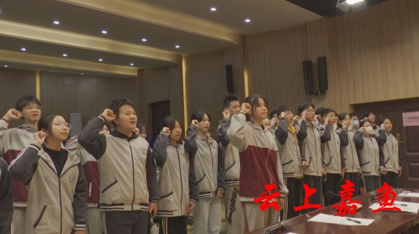 云上嘉鱼报道(全媒体记者杨祖勇)“我志愿加入中国共产主义青年团,坚决拥护中国共产党的领导,遵守团的章程,执行团的决议,履行团员义务,严守团的纪律,勤奋学习,积极工作,吃苦在前,享受在后,为共产主义事业而奋斗!”4月27日,嘉鱼县“学习二十大、永远跟党走、奋进新征程”2023年新团员示范性集中入团仪式在南嘉中学团校举行。30名中学生举起右拳,面向团旗庄严宣誓,铿锵有力的誓言久久回荡在教室。