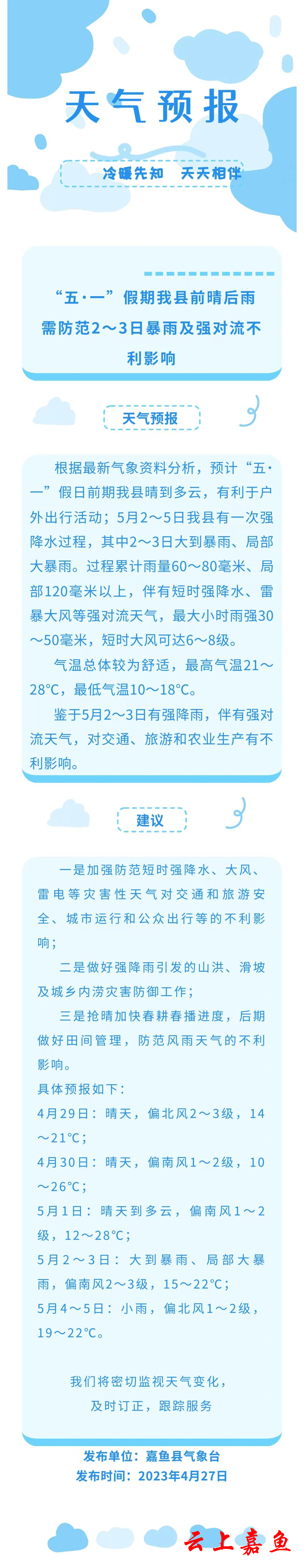 “五一”假期我县前晴后雨,需防范2~3日暴雨及强对流不利影响