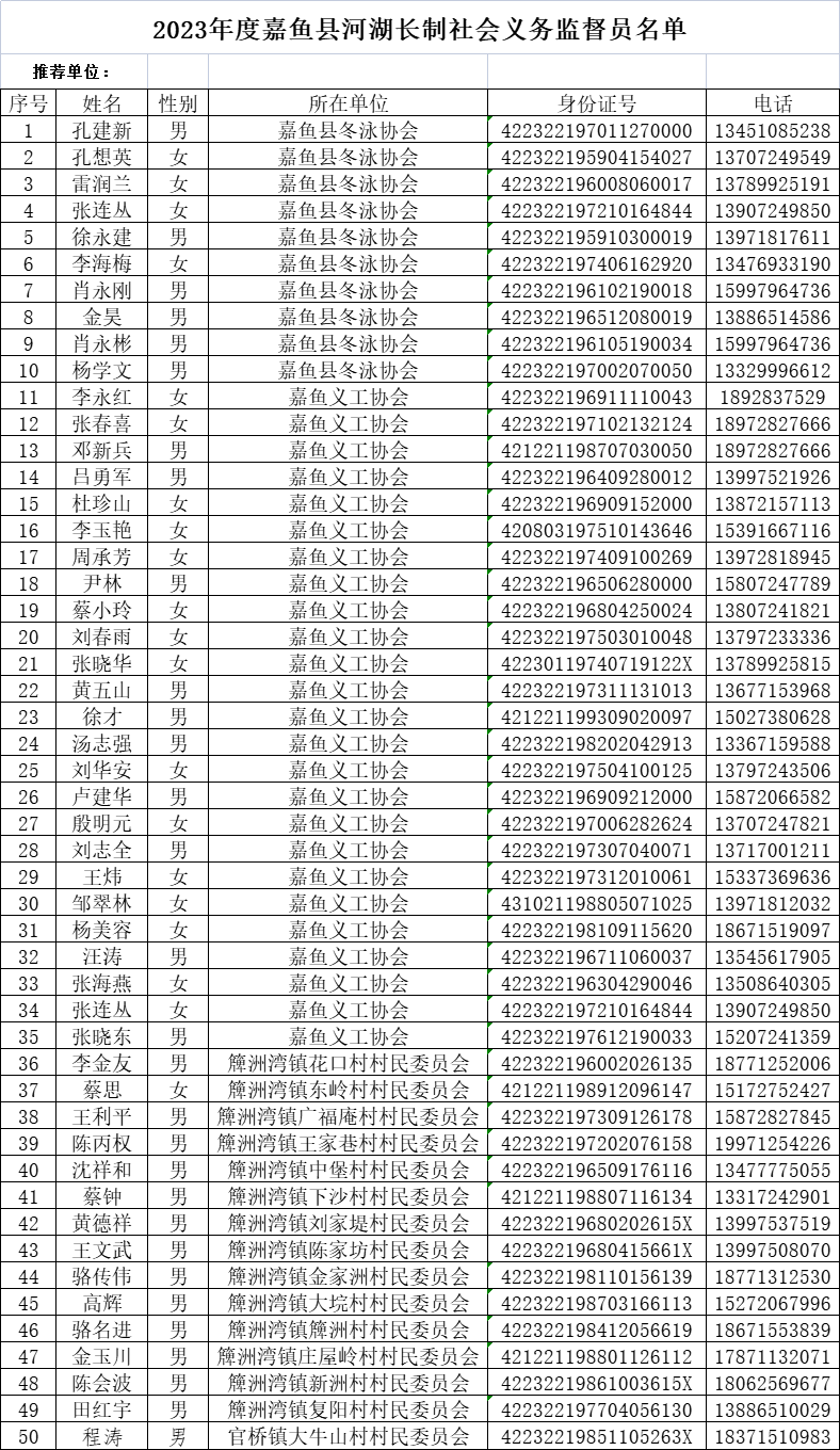 附:嘉鱼县河湖长制社会义务监督员申请人员名单