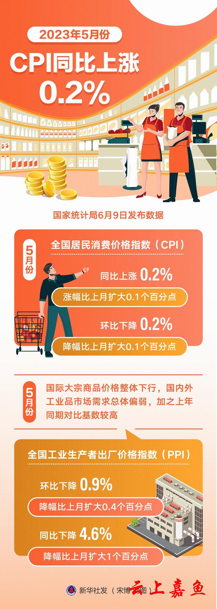 新华社北京6月9日电(记者魏玉坤、韩佳诺)国家统计局9日发布数据,5月份,全国居民消费价格指数(CPI)同比上涨0.2%,涨幅比上月扩大0.1个百分点;环比下降0.2%,降幅比上月扩大0.1个百分点。