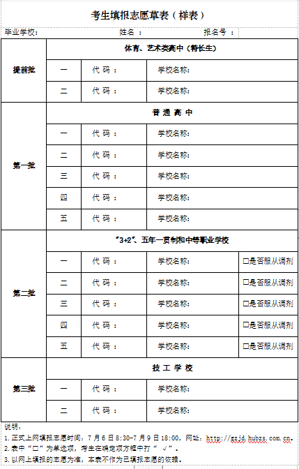 今年中考共设4个批次志愿栏目。提前批设特长生2个梯度志愿;第一批设普通高中5个平行志愿;第二批设包括“3+2”、五年一贯制专业和中职学校5个平行志愿;第三批设技工学校2个平行志愿。“考生填报志愿草表”(样表)如下: