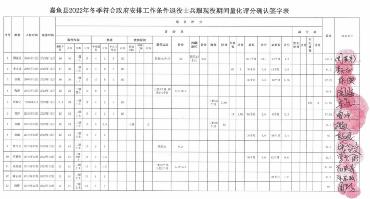 根据《退役士兵安置工作条例》和符合政府安排工作条件退役士兵服役表现量化评分暂行办法等有关政策规定,县退役军人安置工作领导小组依据本人档案,对服役表现量化评分进行复核,并经本人签字认可。现将周亚光等全县13名2022年冬季符合政府安排工作退役士兵服现役期间表现量化评分情况公示如下: 公示时间为5天,即从2023年6月26日起至6月30日止。如有意见或问题反映的,请向嘉鱼县退役军人安置工作领导小组办公室反映,电话0715-6339756。 嘉鱼退役军人安置工作领导小组办公室 2023年6月26日