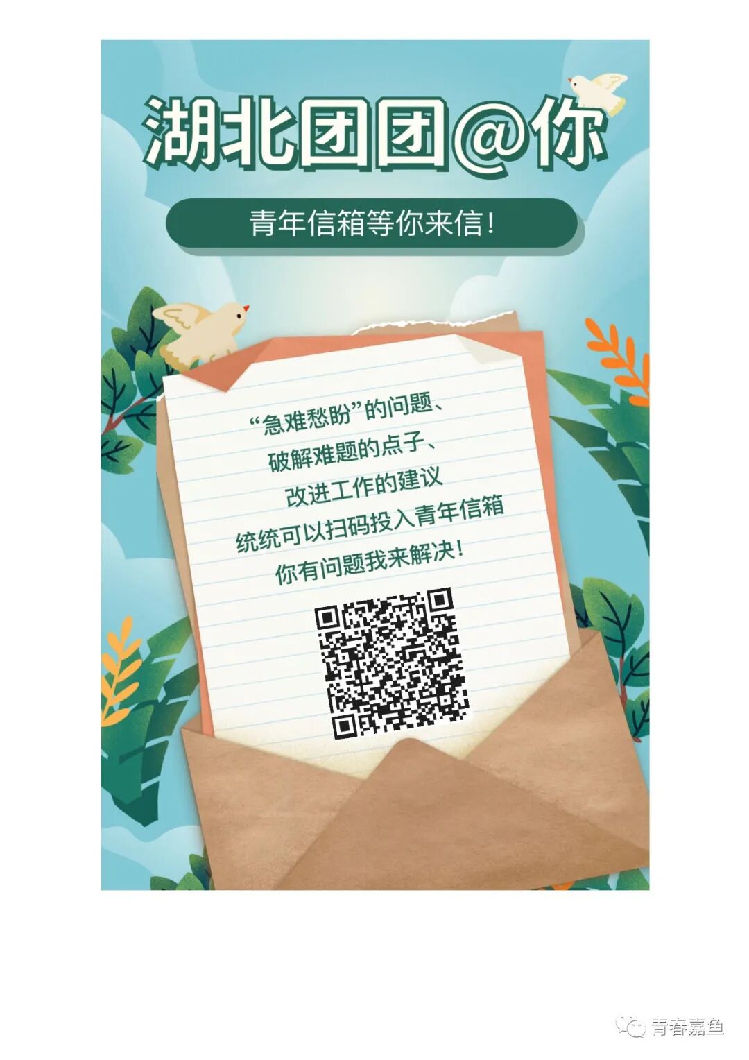 结合湖北共青团下基层察民情解民忧暖民心实践活动和“三联五助”行动,“青春嘉鱼”特别开设了“青年信箱”专区,征集青年建议、倾听青年声音、回应青年诉求帮助解决青年“急难愁盼”问题。有什么问题、困难或者解决建议、方案,统统都可以投递到“青年信箱”。