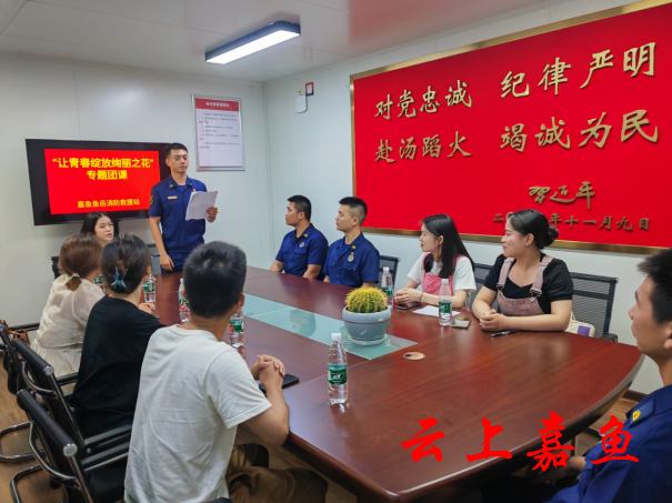 县消防救援大队鱼岳消防救援站相关负责人以“让青春绽放绚丽之花”为题讲授了一堂主题团课;活动还宣读了青春倡廉书。