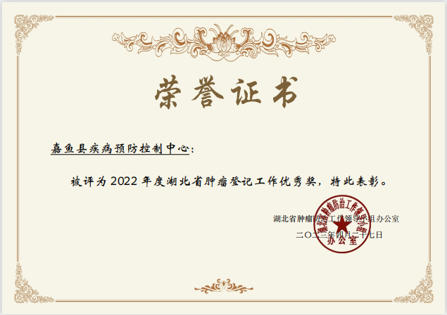 “我们以科学认真的态度开展肿瘤监测工作,能为人类早日突破癌症防治‘瓶颈’作出一份贡献,是我们的光荣!”嘉鱼县疾控中心慢病科负责人表示。由于工作业绩突出,该中心2019-2022年连续四年获得湖北省年度“肿瘤随访登记项目先进集体”荣誉称号。