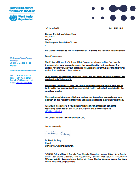 国际癌症研究机构五大洲癌症发病率数据库给嘉鱼疾控的收录回执信